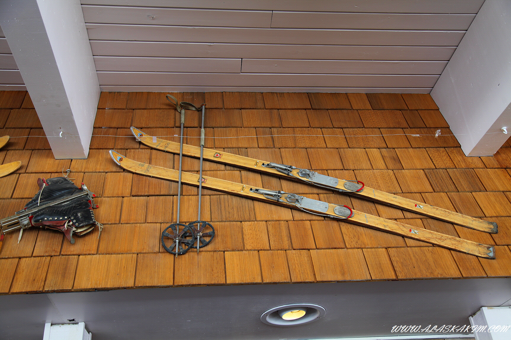 나무를 깍아 스키를 만들고, 스프링과 철사로