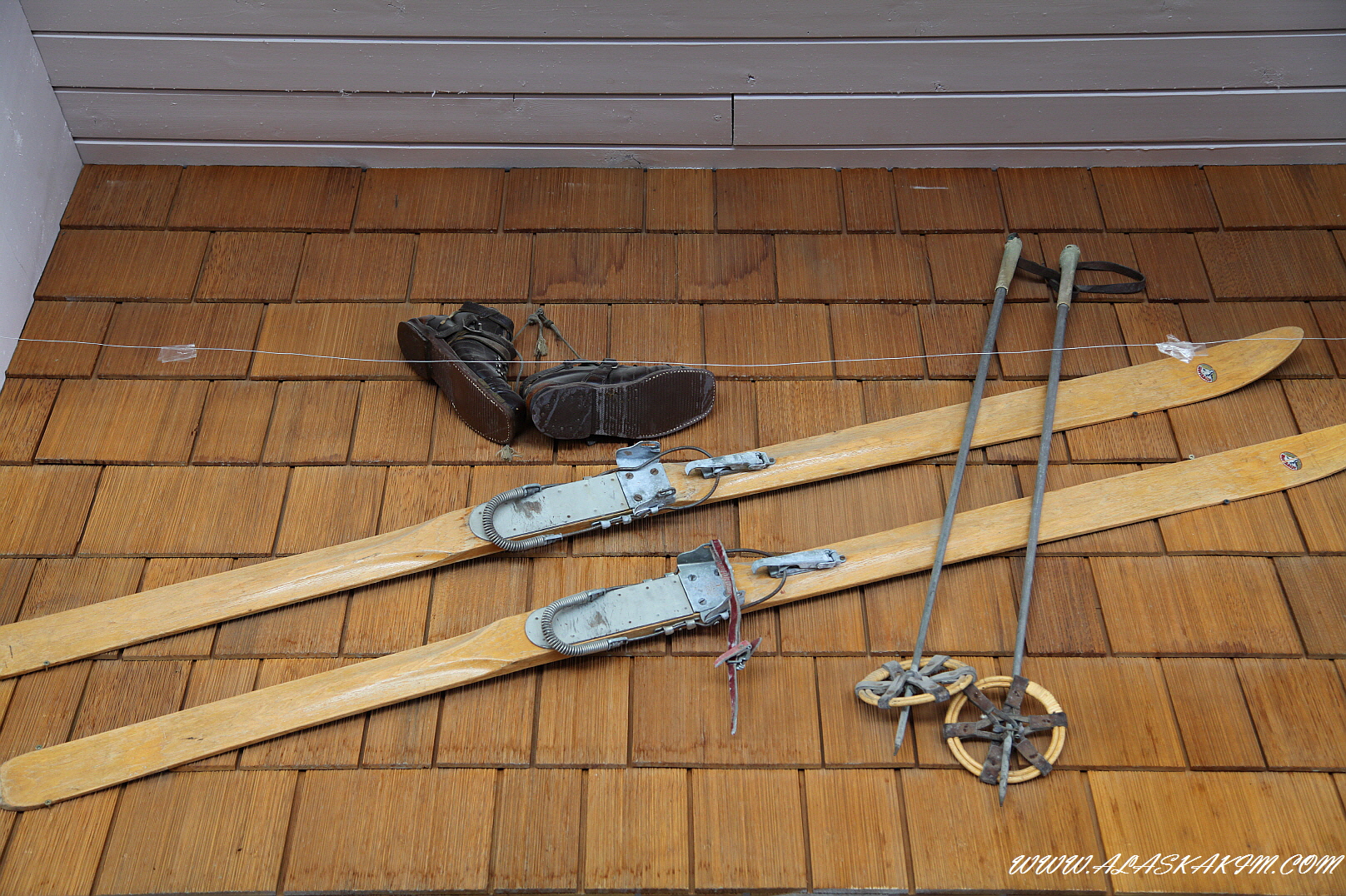 나무를 깍아 스키를 만들고, 스프링과 철사로
