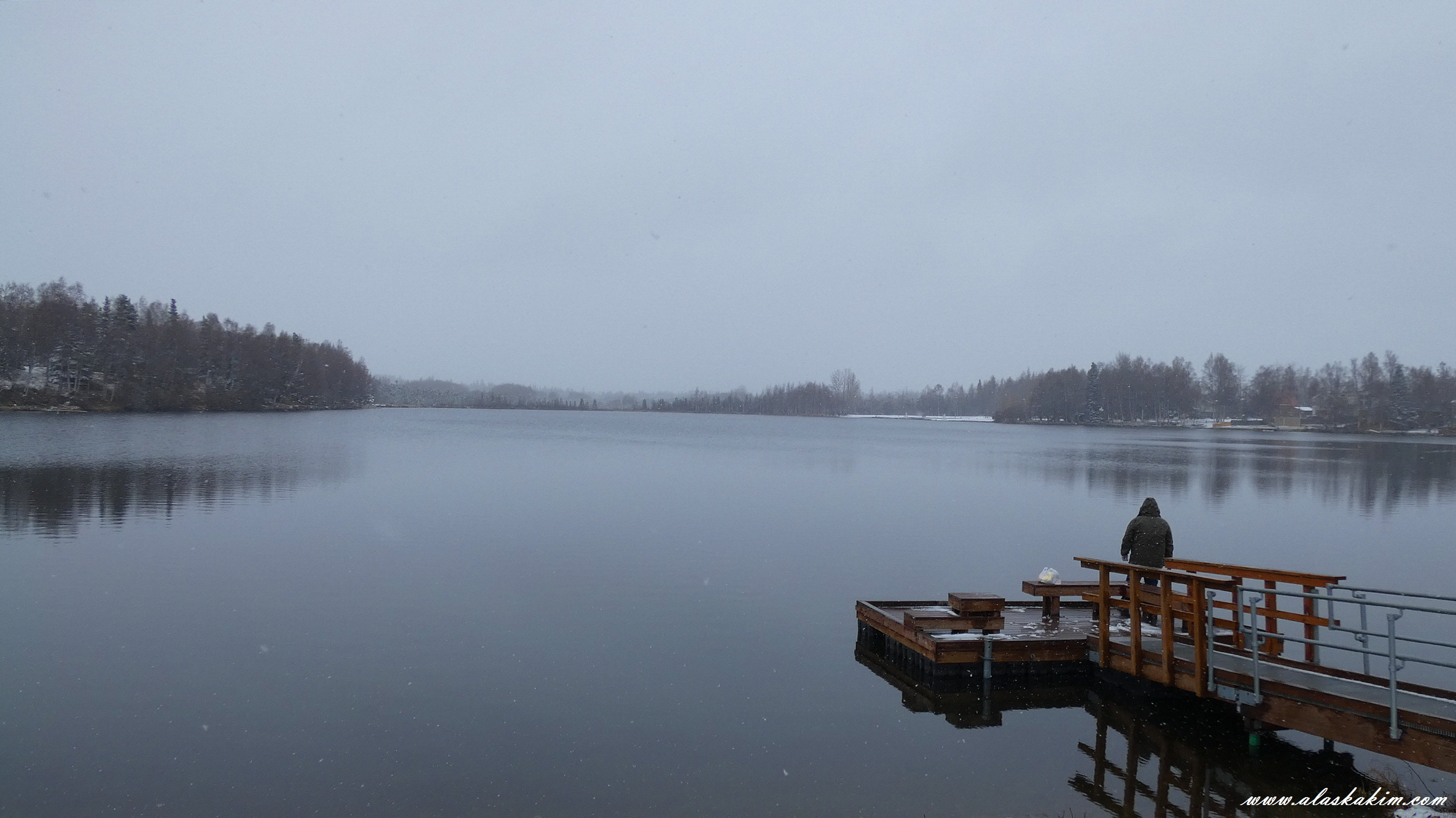 눈 내리는 모습을 감상하기 위해 호수에 잠시 들렀더니,