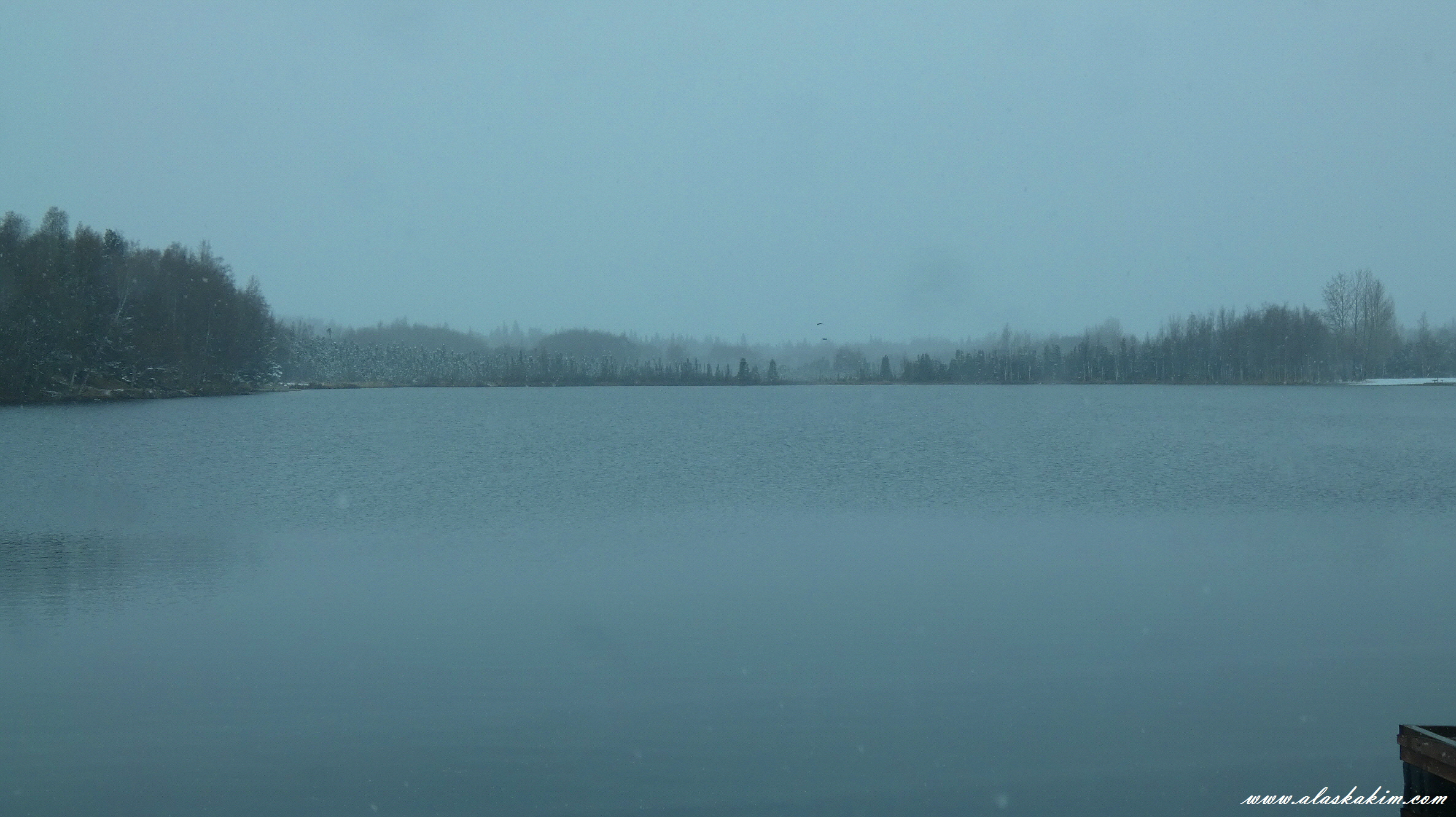 함박눈이 호수 위로 살포시 내려앉는 모습이