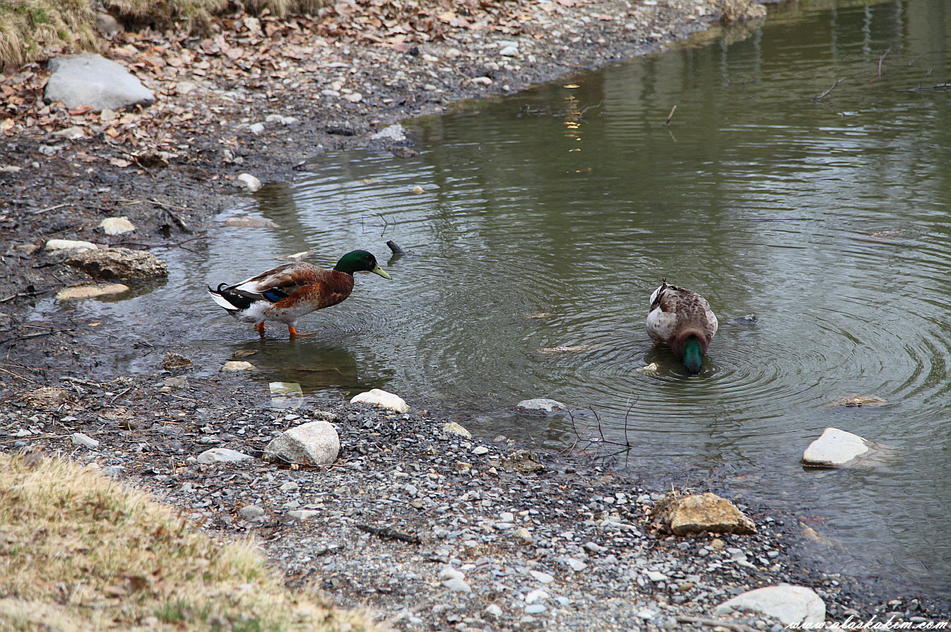 양 옆, 작은 호수에는 오리와 청둥오리들이 온천욕을