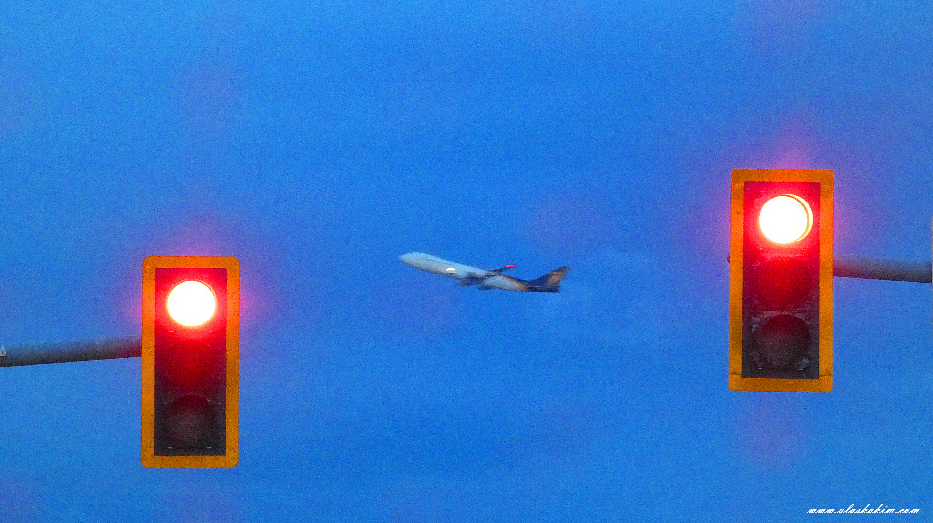 신호등 사이로 날아가는 UPS 화물 비행기를 절묘하게