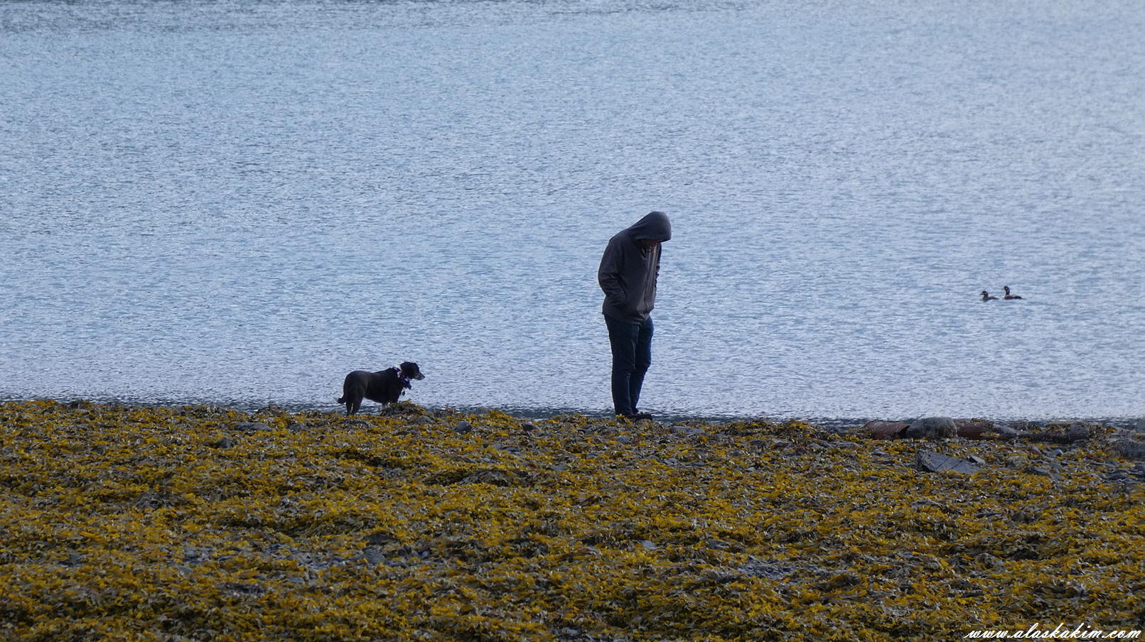 아침에 일어나 애견과 함께 아침 바다를 산책하고 있네요.