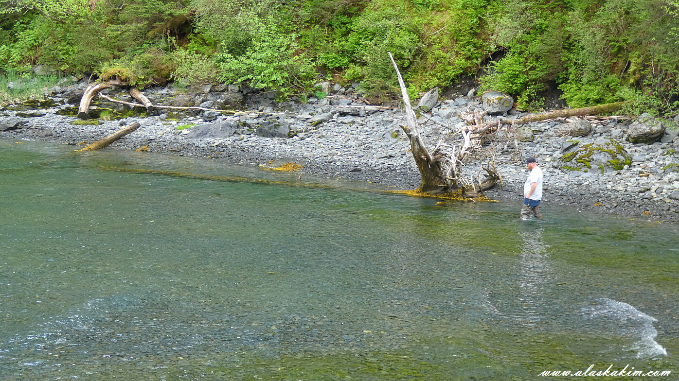 지금 연어 낚시철이라 다들 분주하기만 한데, 저는 새우망을 건져 올리기