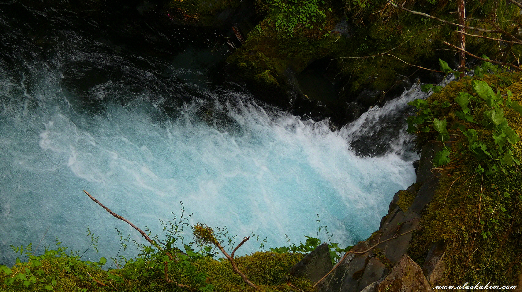 빙하가 녹으면서 폭포수로 변하는 물의 색이 옥빛입니다.