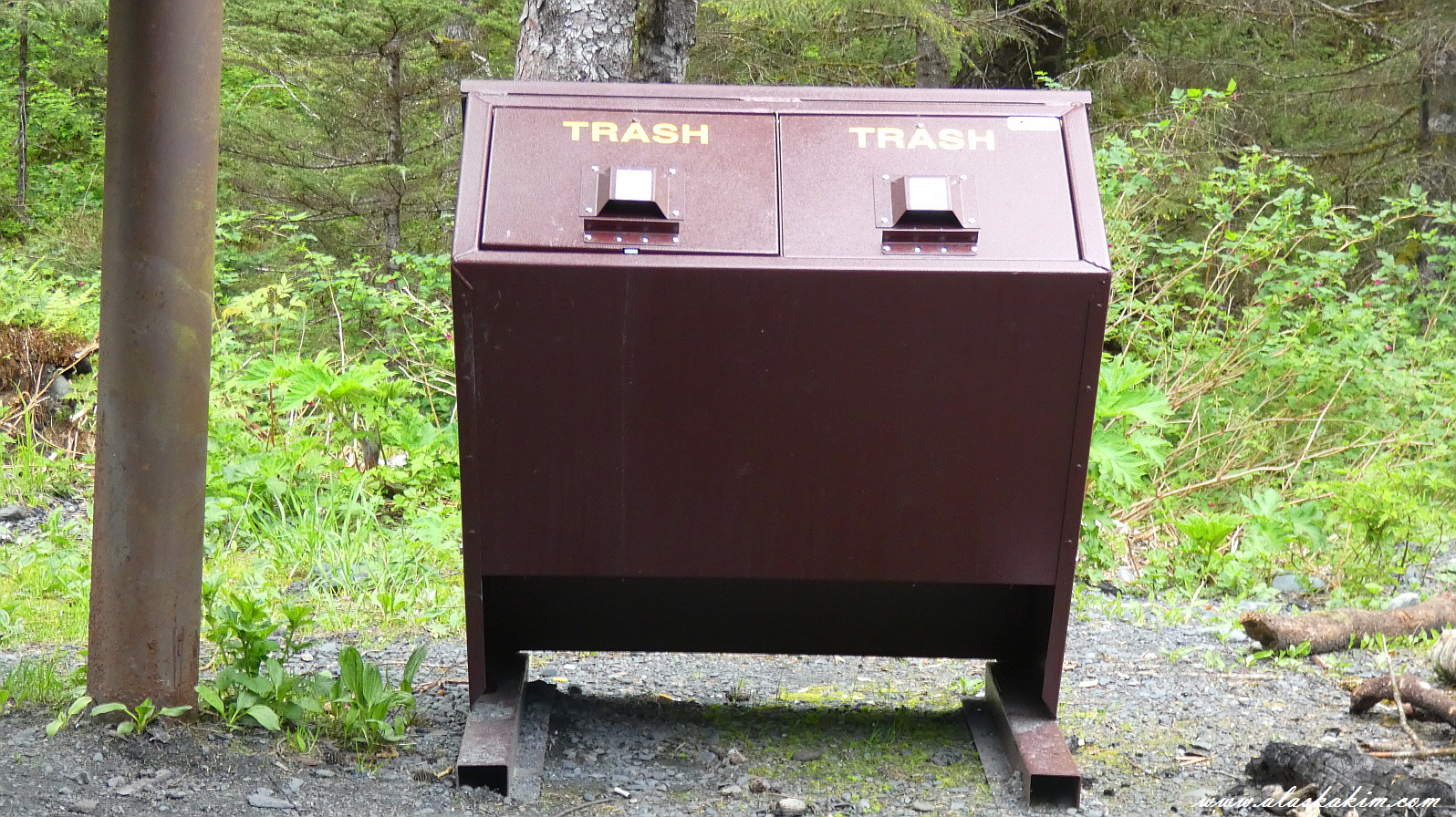 곰이 가끔 쓰레기통을 뒤지니 사람만 뚜껑을 열 수 있도록 해 놓았습니다.