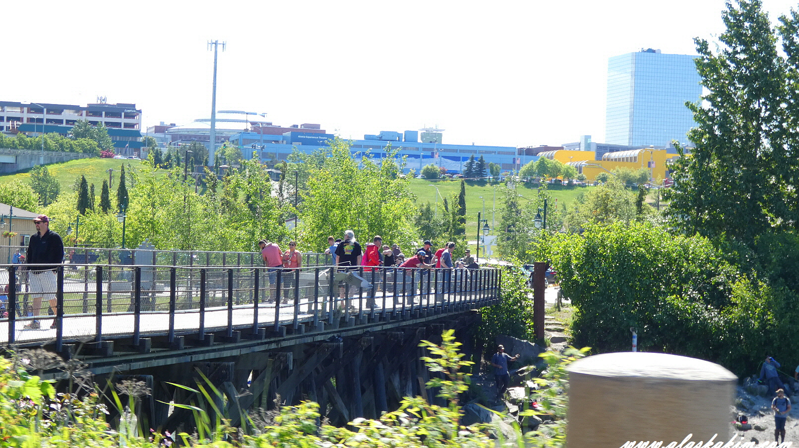 알래스카 여행을 이들은 신기한 듯, 다리 위에서 연어 낚시를 하는 모습을