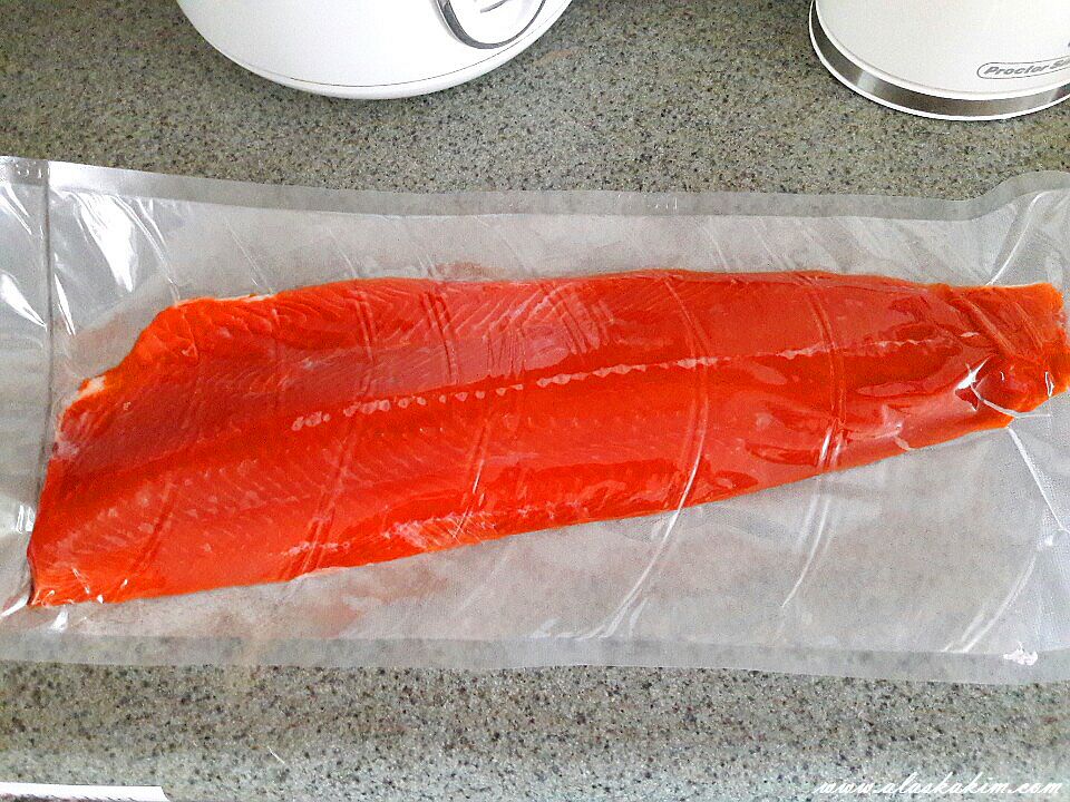 밀봉 작업을 마치게 되는데, 이때, 공기 빠지는 소리가 들릴 때, 연어에 공기가 있는 부분을