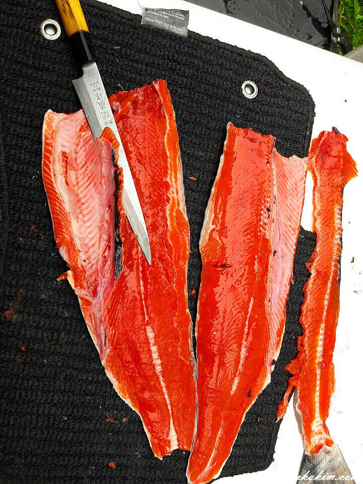 총 11마리의 연어를 이틀간에 걸쳐 잡아 그 자리에서 바로 머리와 내장을
