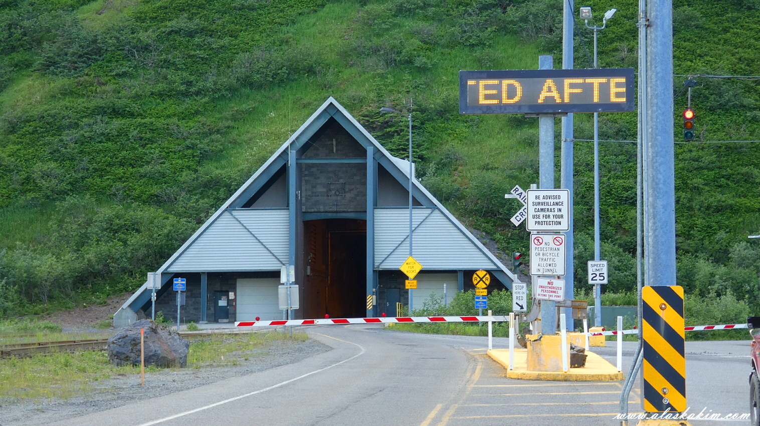 위디어 터널을 통과해 위디어에서 앵커리지로 가는 관광 열차입니다.