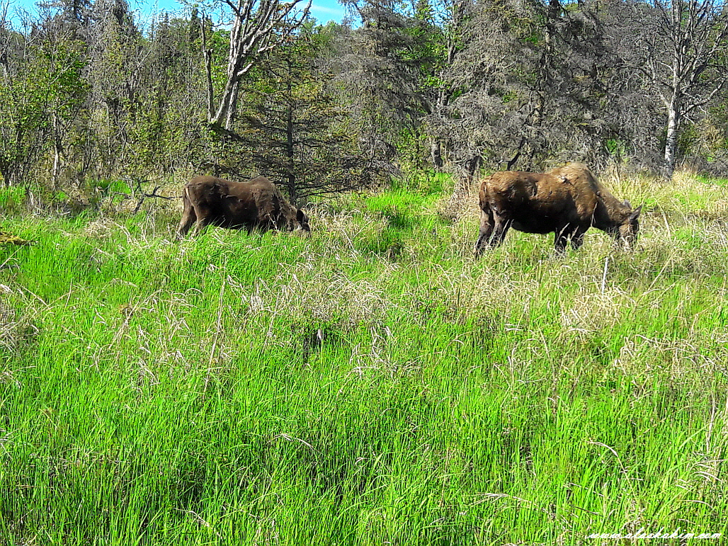 알래스카에서는 어미 무스와 함께 풀을 뜯는 아기 무스도 자주 만날 수 있습니다.