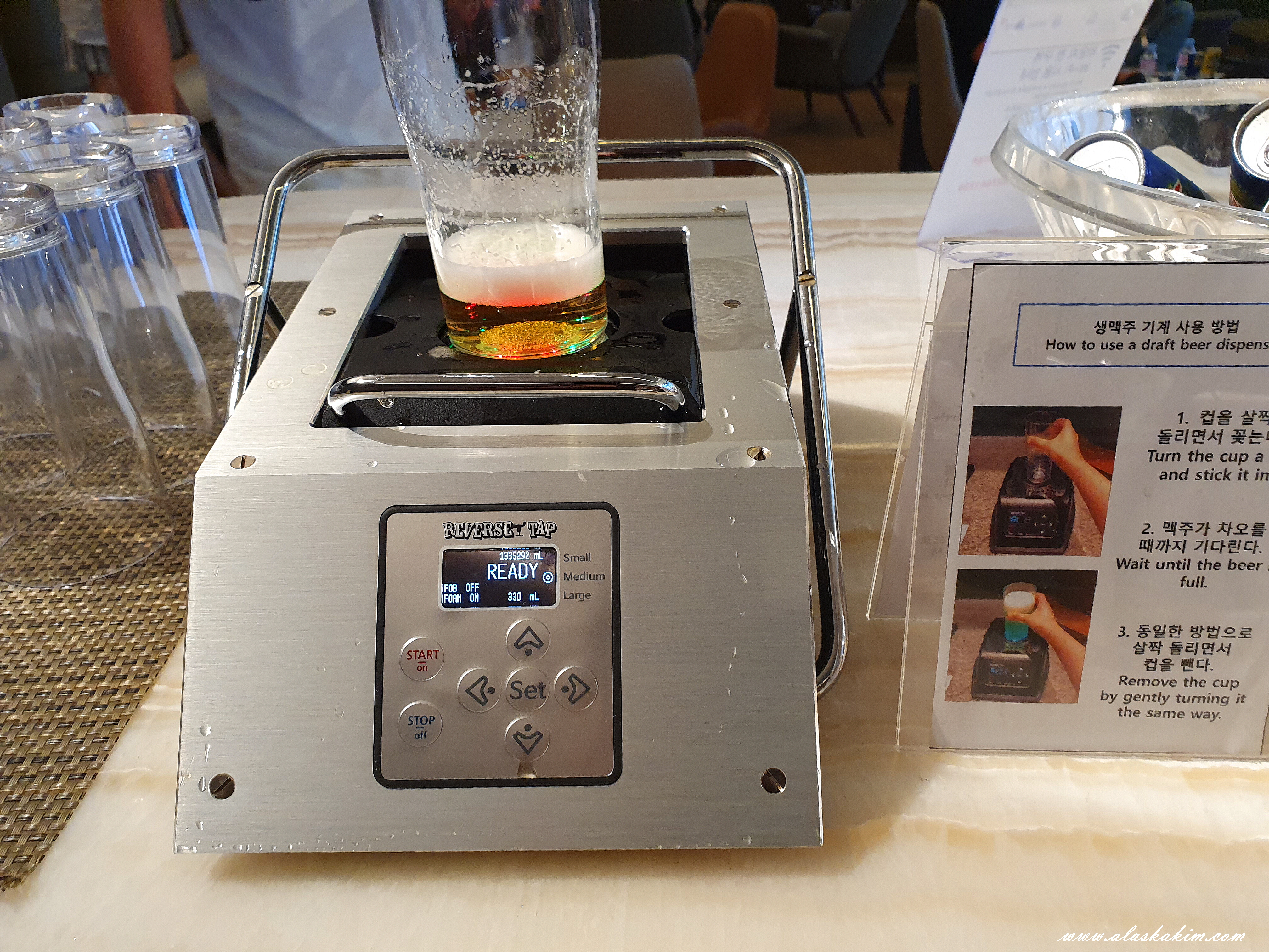 컵을 올려놓고 살짝 눌러서 비틀면 밑에서 맥주가 올라와 잔을 채웁니다.