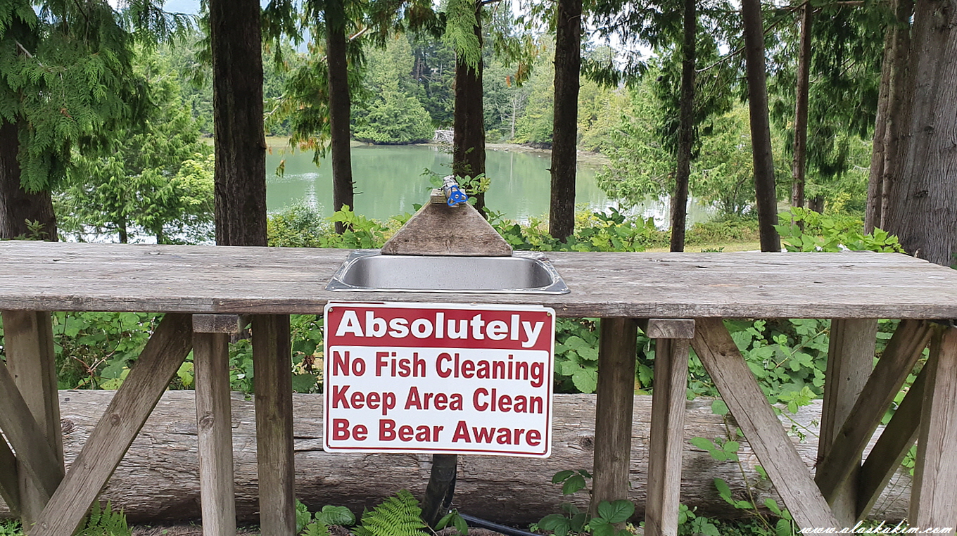 곰이 오니, 여기서 물고기 손질을 하지 말라고 하네요.