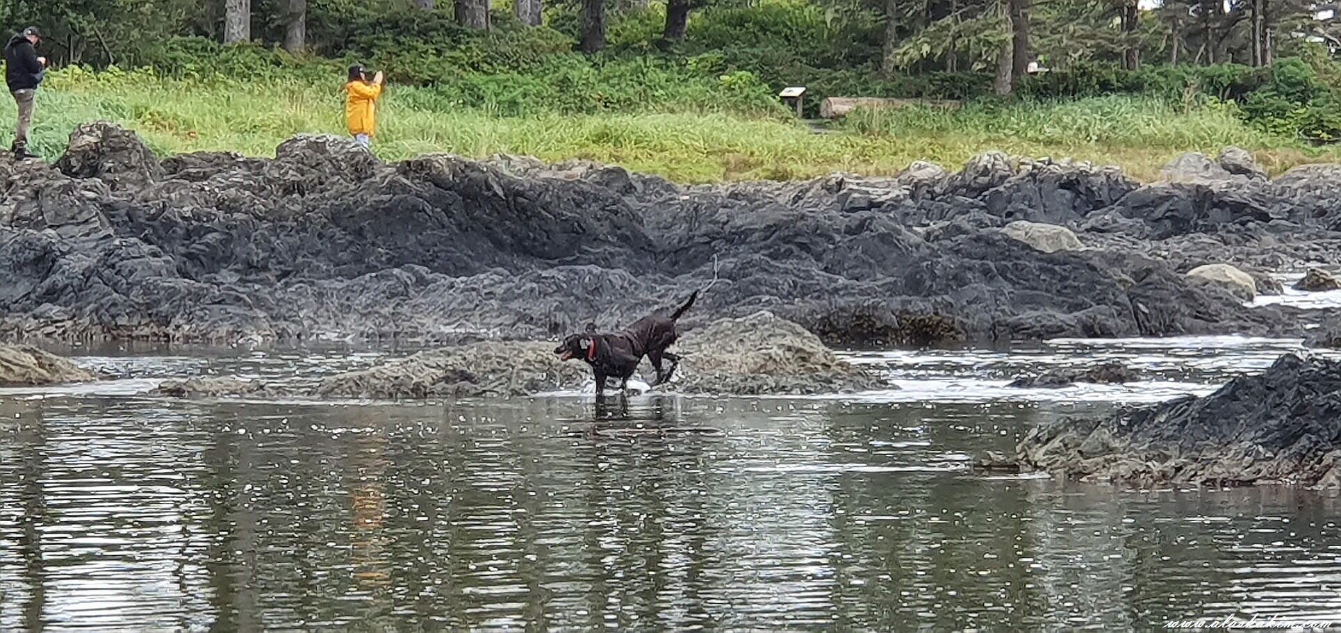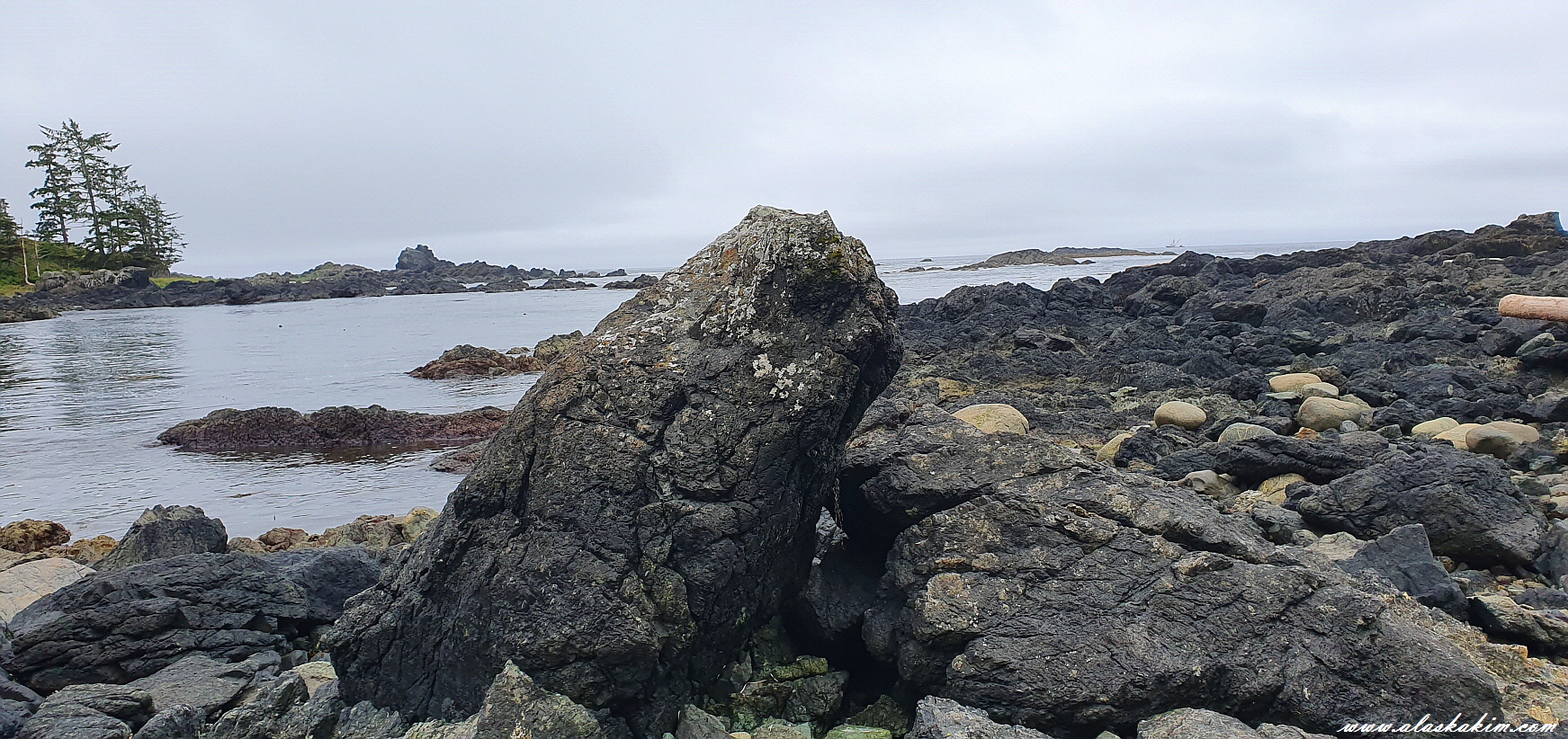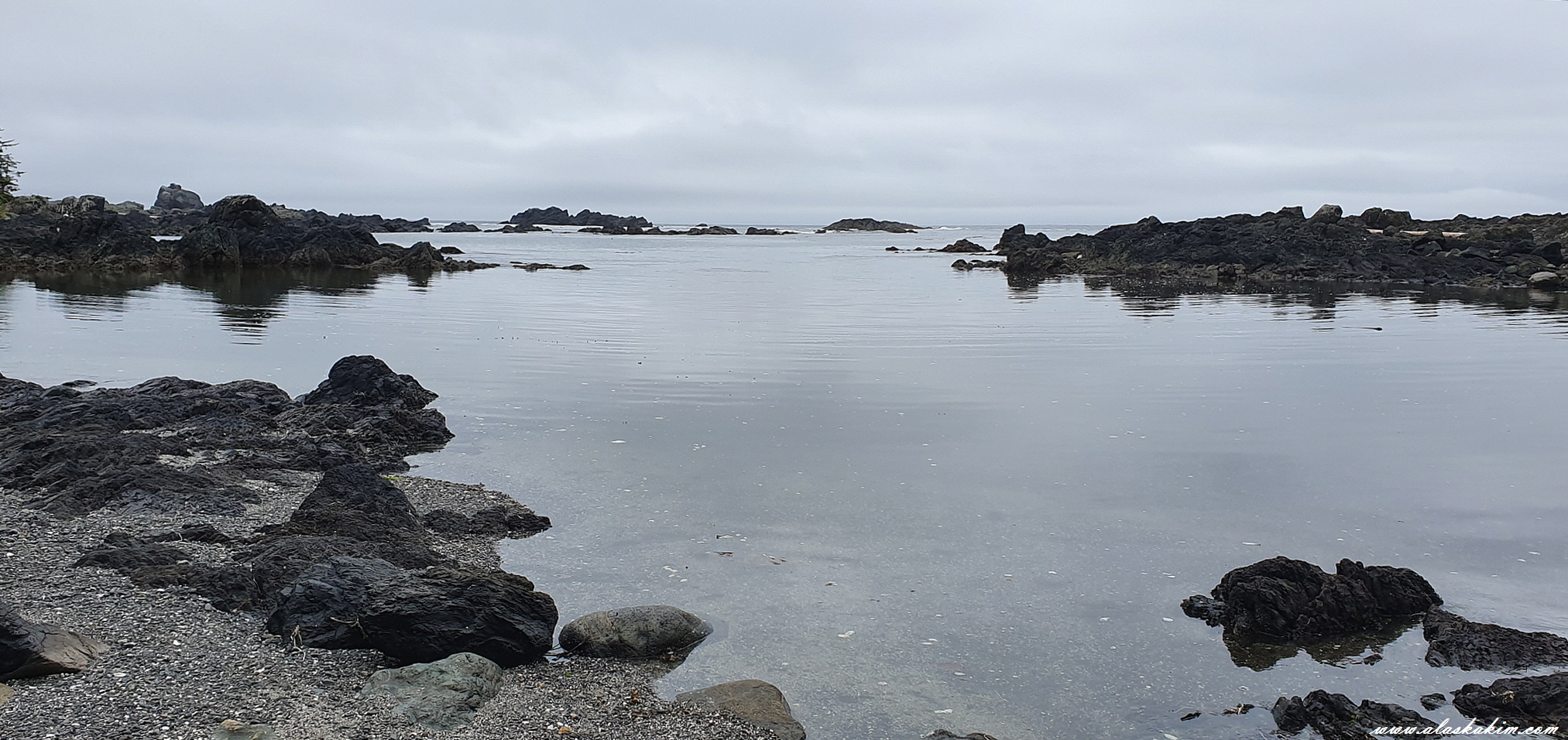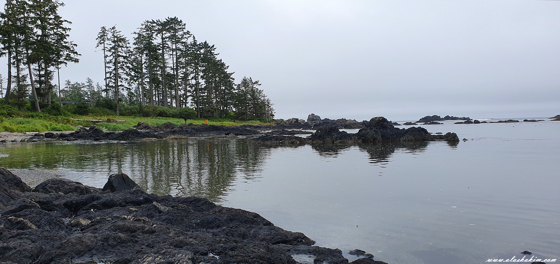 지금 썰물 때라 물이 많이 빠져 바위들을 밟으며 바닷가를