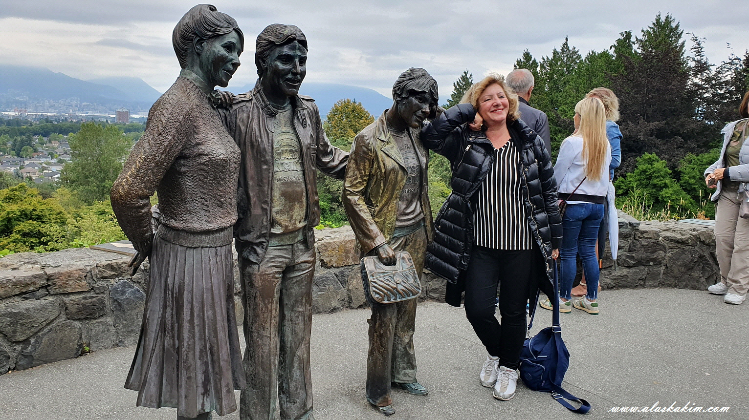 행복한 미소를 지으며 동상과 함께 사진을 찍는 모습이