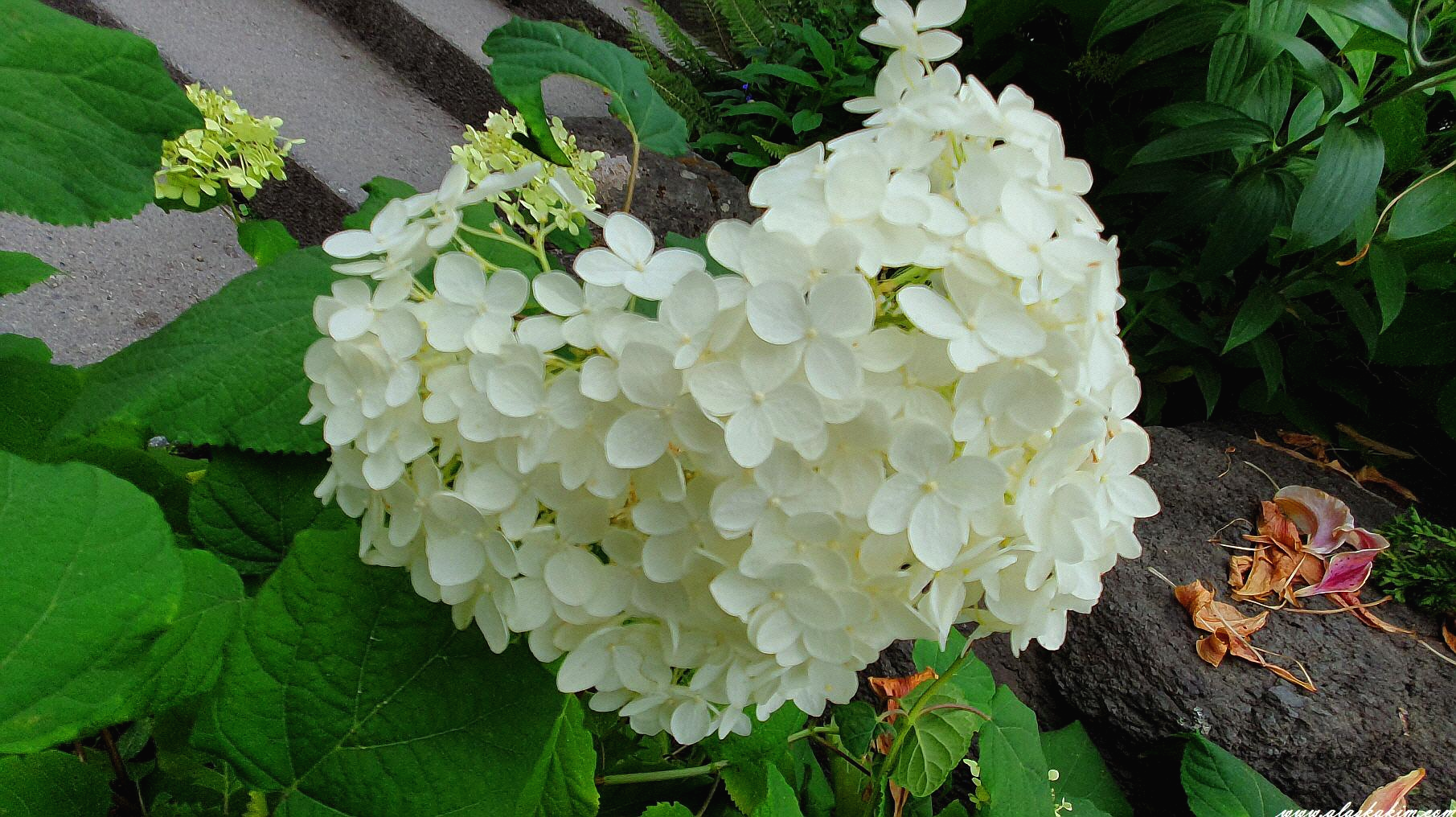 하얀 수국이 머리를 내밀며 인사를 건넵니다.