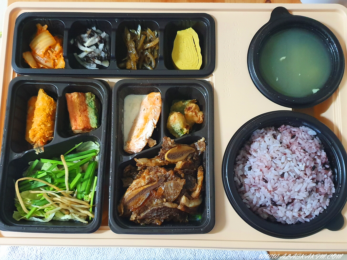 엘에이 갈비, 잡곡밥에 된장국 그리고, 연어구이까지