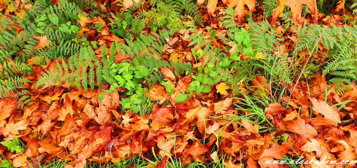 낙엽은 이끼와 돌과 오솔길을 덮고 있다.