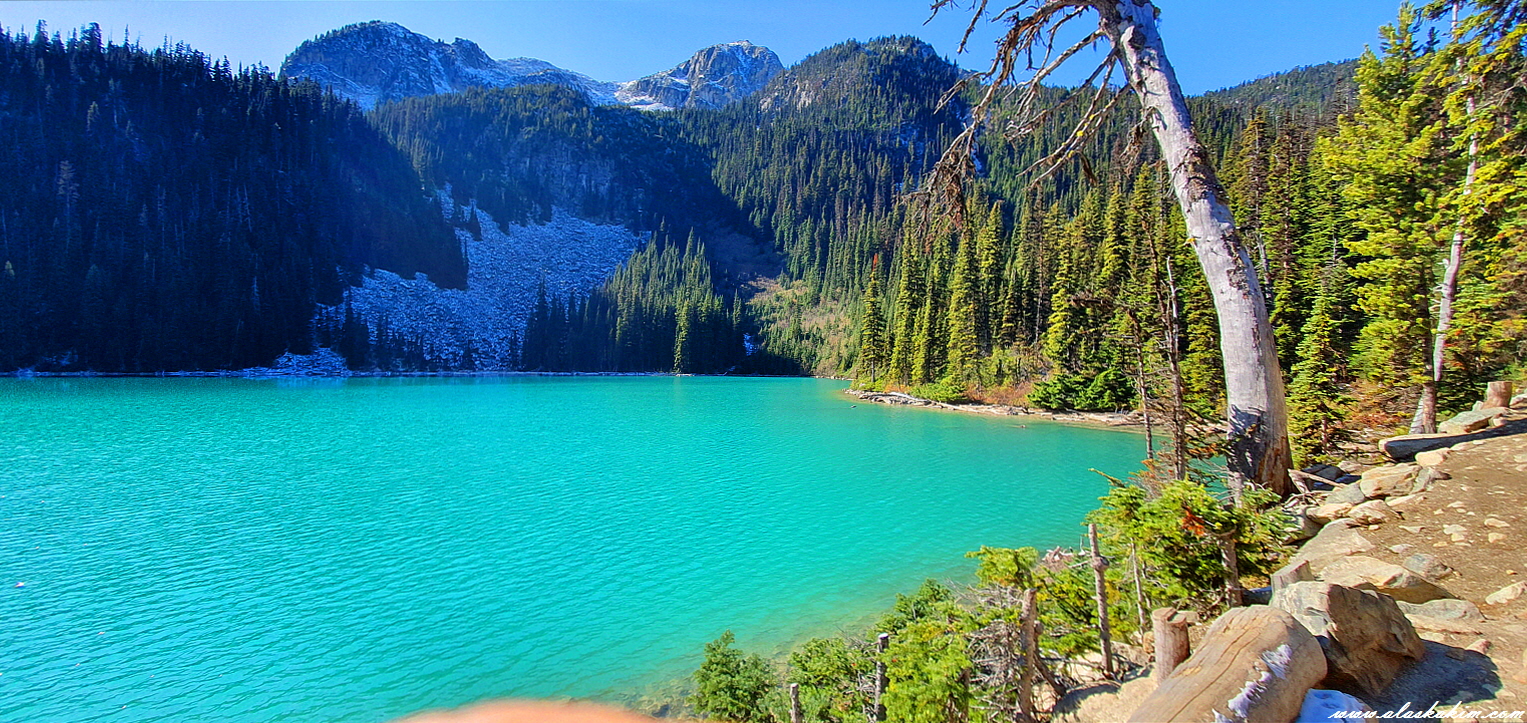 첫 번째 호수에 나무 한그루가 넘어져 있는데