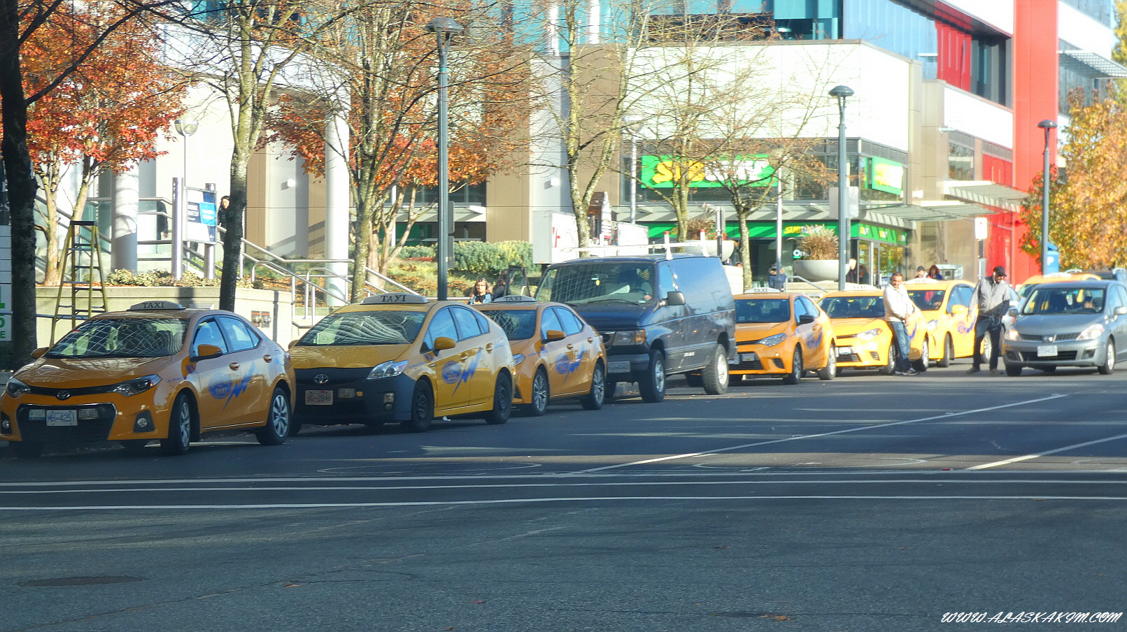 택시들이 전철역 앞에서 줄을 지어 손님을 기다리고 있습니다.