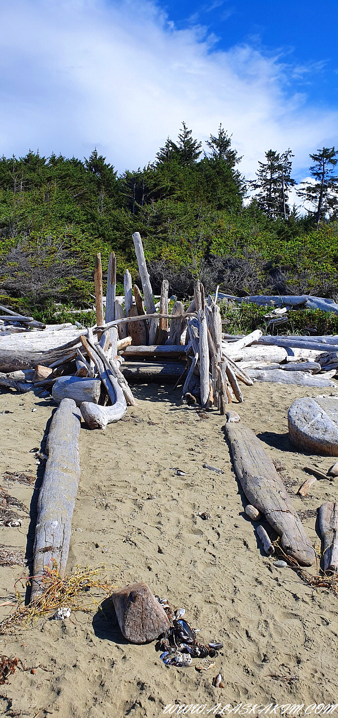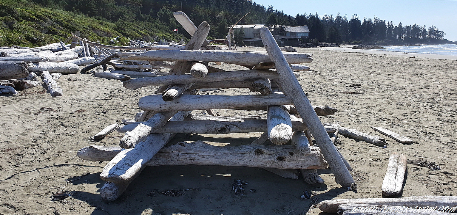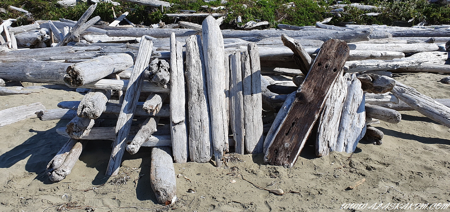 밀려온 다양한 괴목들로 그늘막을 만든 피서지의