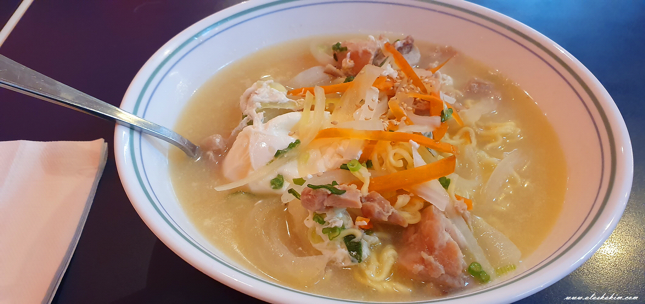 닭 육수를 우려내 끓인 치킨 라면이 담백하고 맛이 좋았습니다.