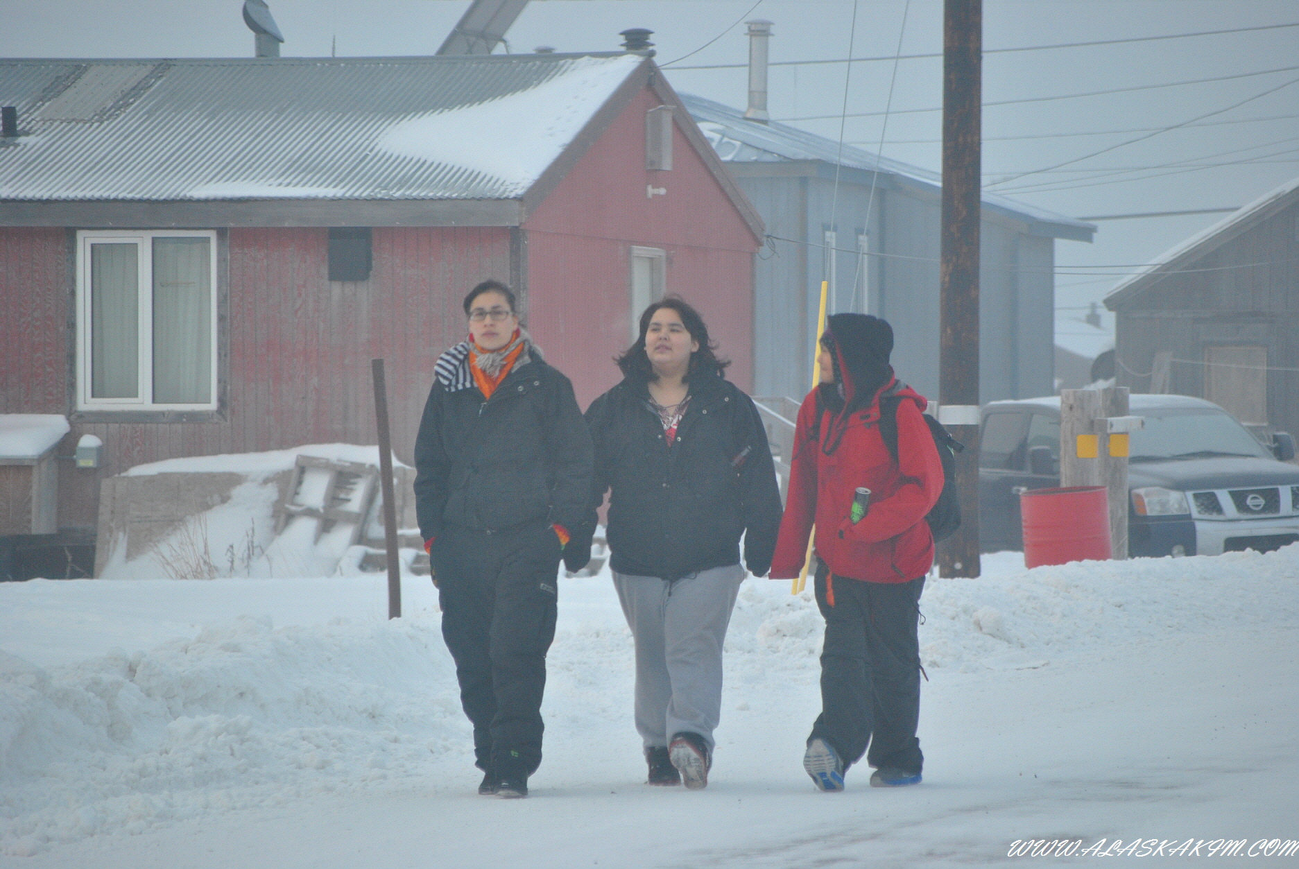 북극 원주민 마을의 학생들이 하교하는 모습.