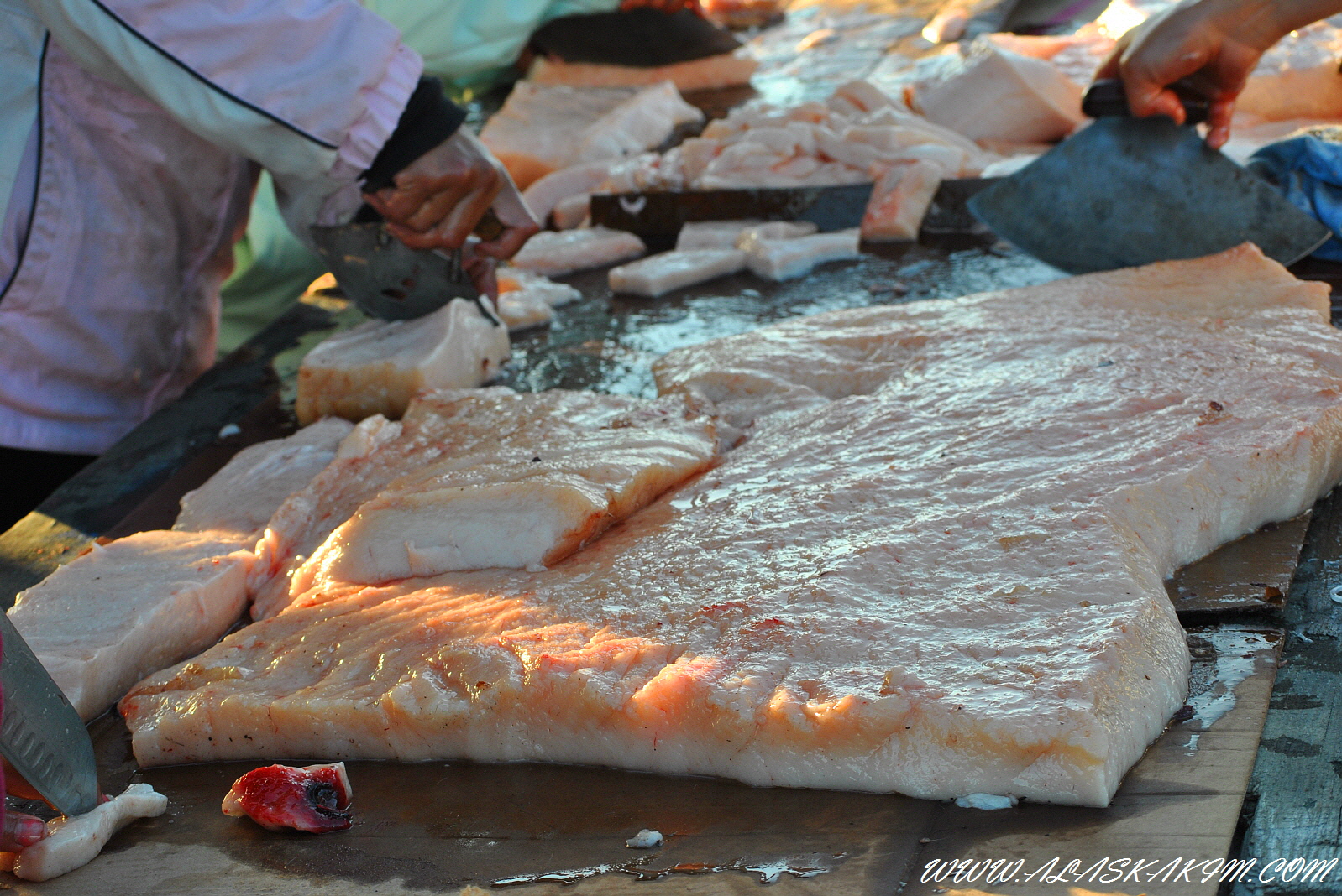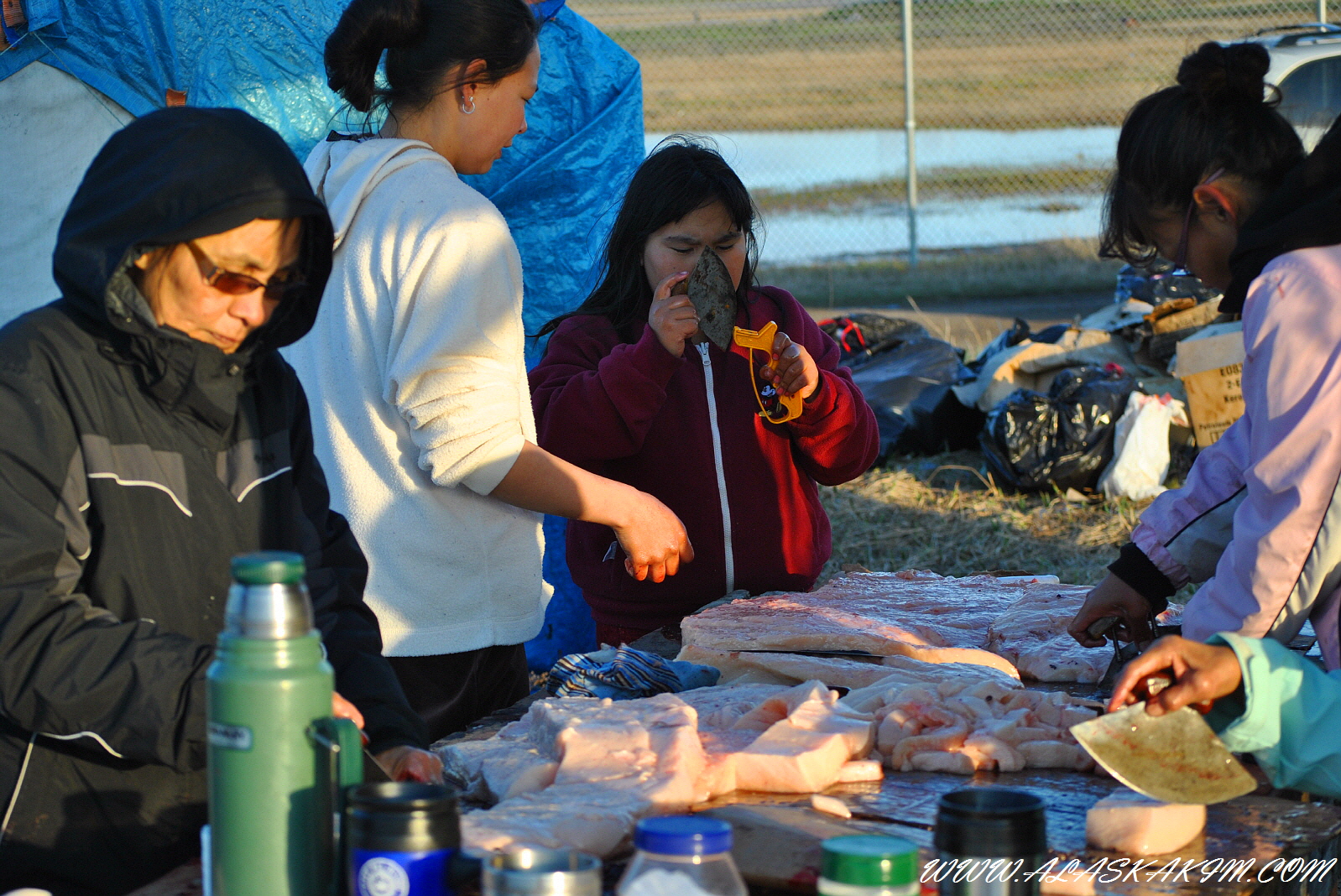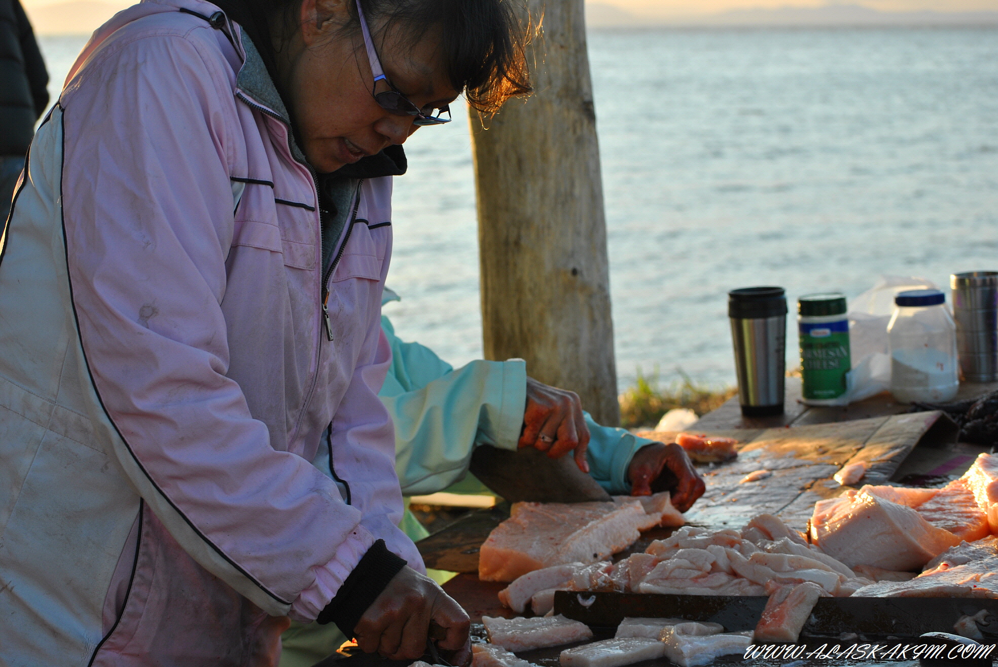 에스키모 전통칼인 반달형의 "우루"로 손질하는 장면입니다.