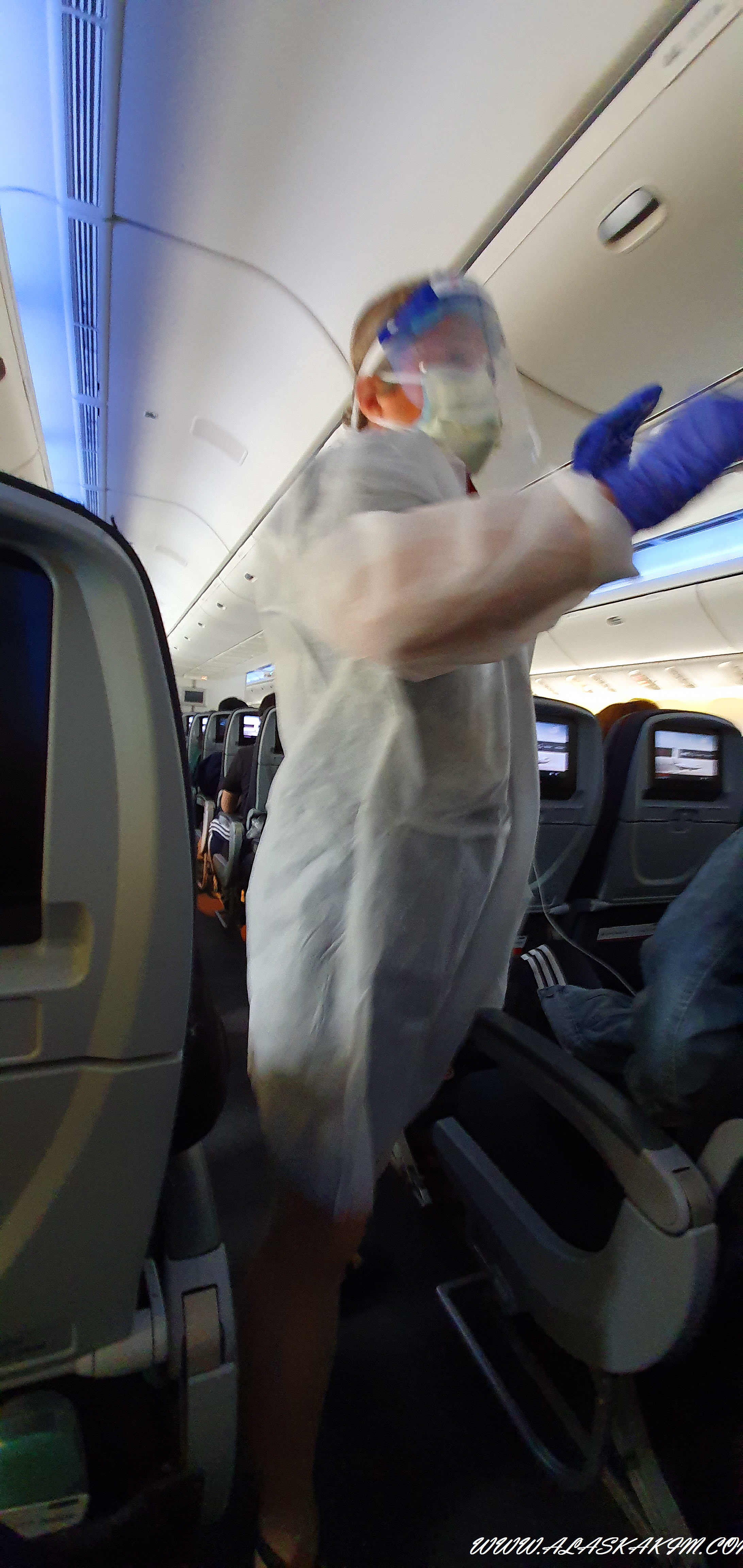 승무원들이 일회용 가운을 입고 짐칸을 정리하거나 서비스를