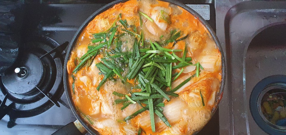 거기에 갈비와 우거지를 넣고 한 소금 끓인 다음, 부추로 마무리를 했습니다.
