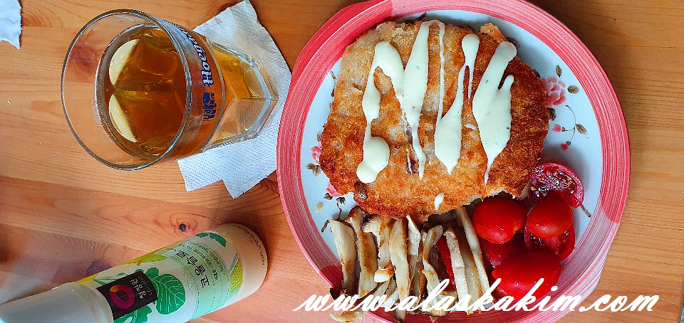그리고 , 콘 슬로 드레싱을 돈가스 위에 뿌려 주었는데