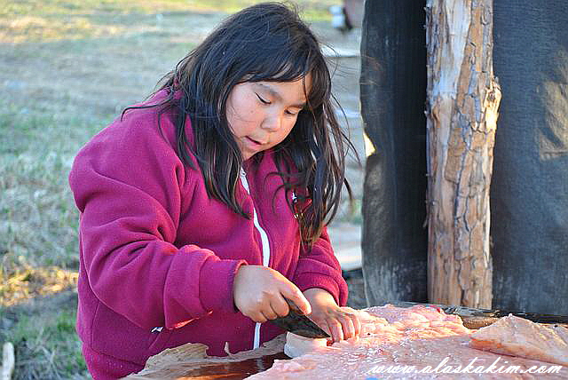 에스키모 전통 부엌칼인 " 우루"를 이용해 물개를 손질하는