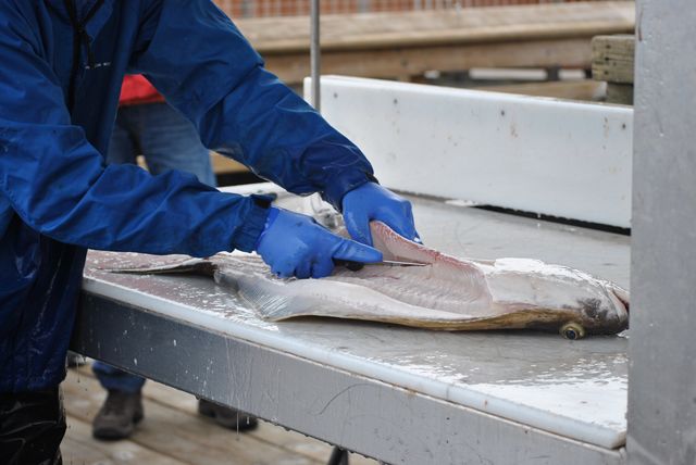 낚시한 광어를 손질하고 있네요