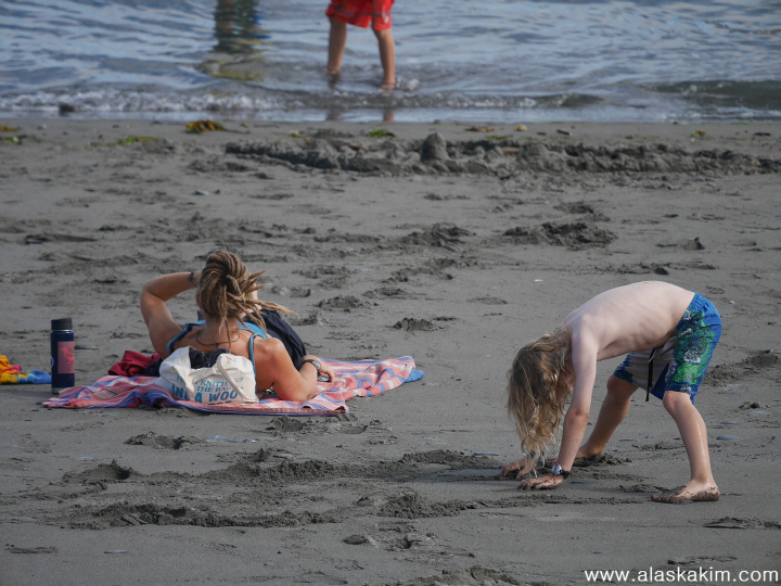 아이들과 함께 온 아이의 엄마는 선탠을 즐기고