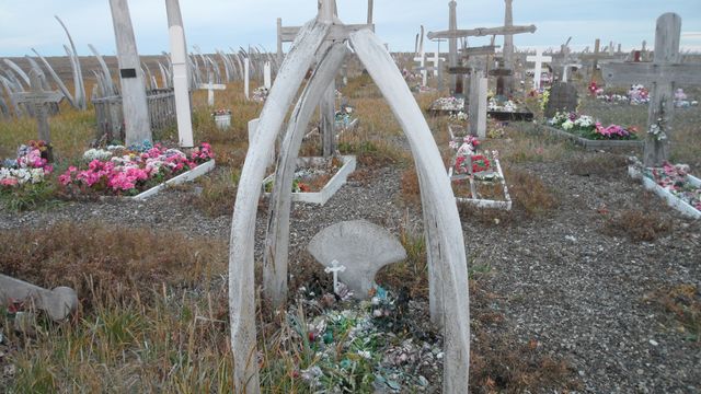 상석 대신 고래뼈로 묘지를 아름답게 치장을