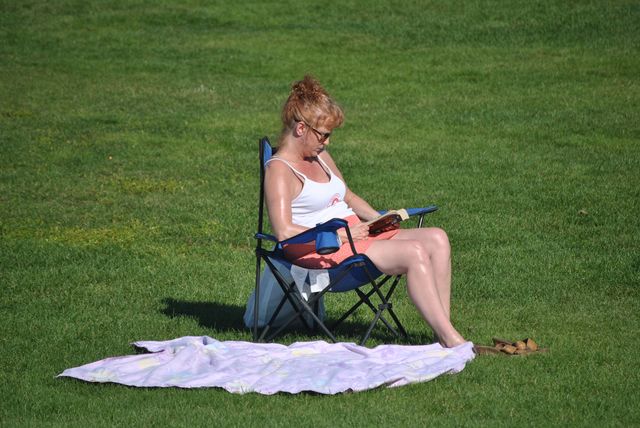 아주머니는 음악을 들으며, 책을 읽고 계시네요.