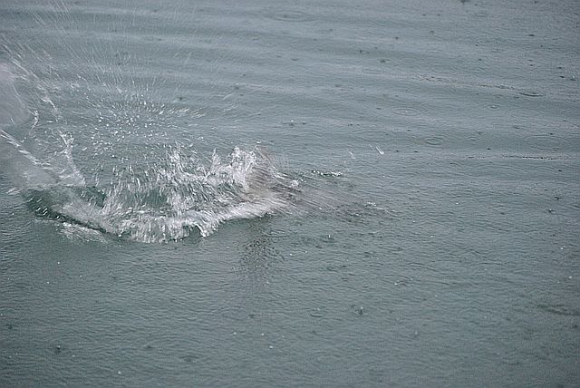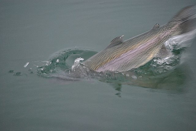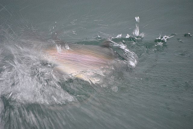 호수 여기저기에서 뛰어오르는 무지개 송어들입니다.