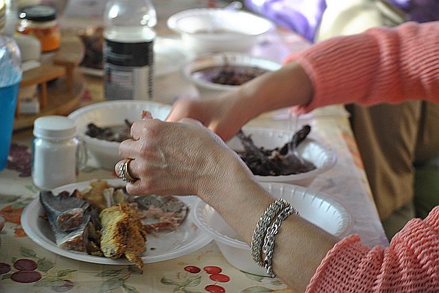 손으로 집어서 앞의 하얀 접시에 있는