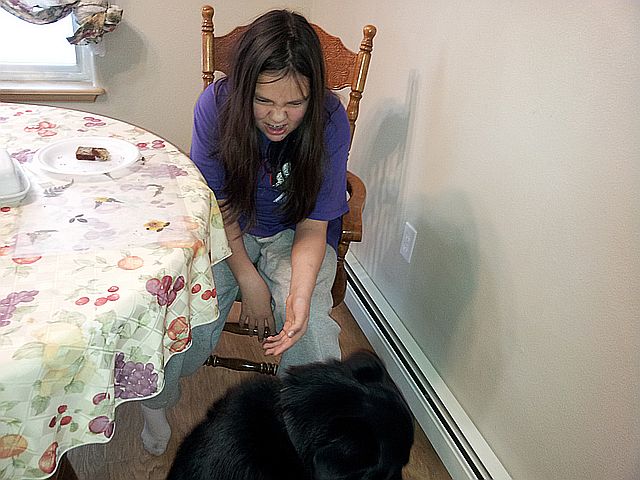 개를 향해 짓궂은 표정을 한 여자아이가 바로 딸입니다.
