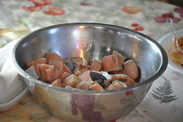 생선을 손으로 찢어서 물개 기름에 푹 찍어서