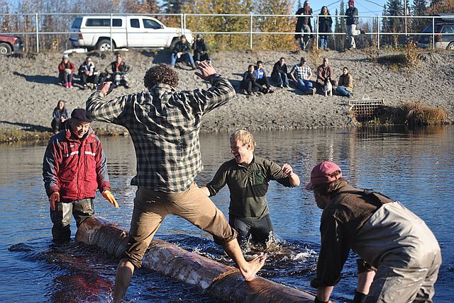 약 3미터의 통나무를 물 위에 띄우고 , 서로 통나무를 굴려