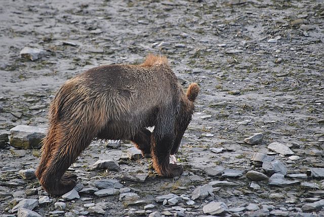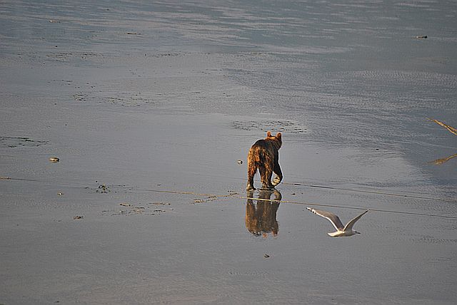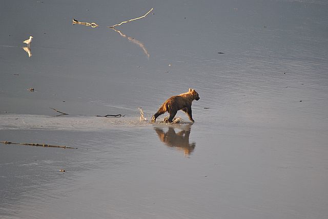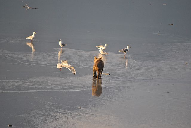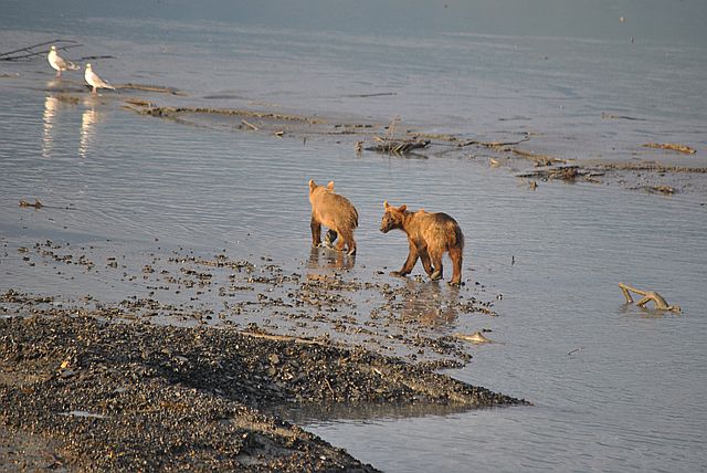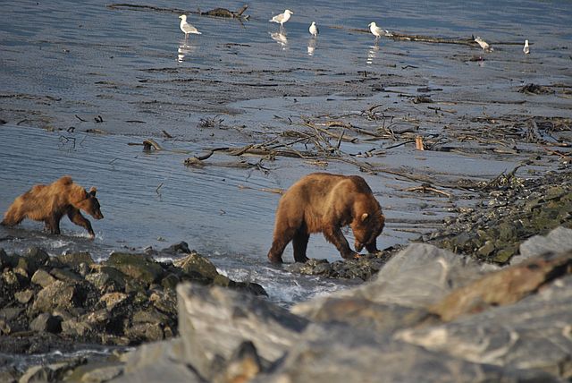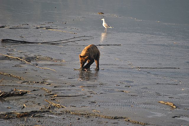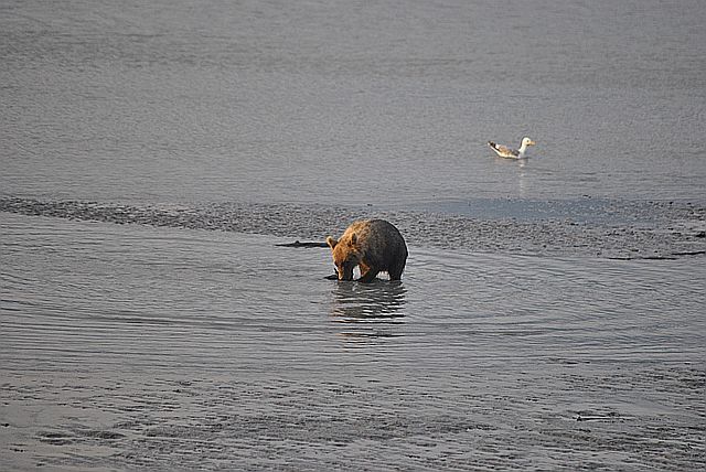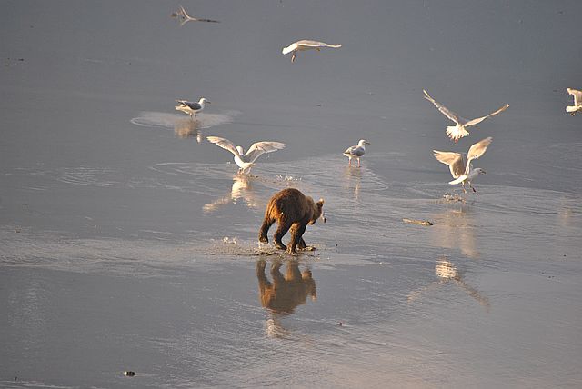 갈매기들은 곰이 먹다 남은 부산물을 차지합니다.
