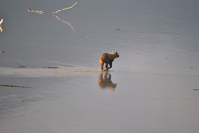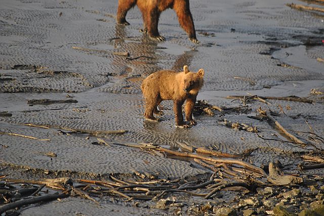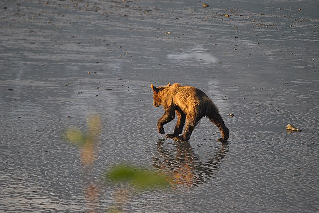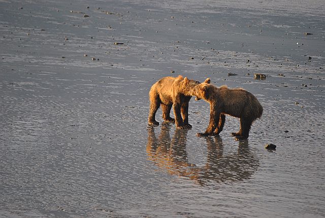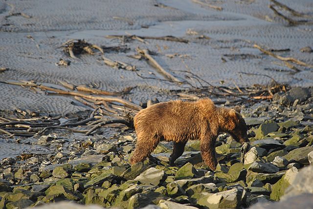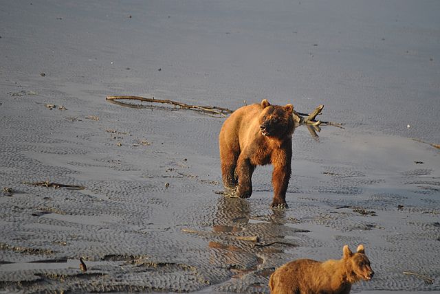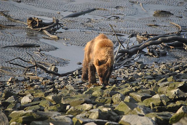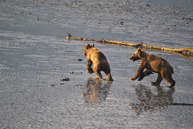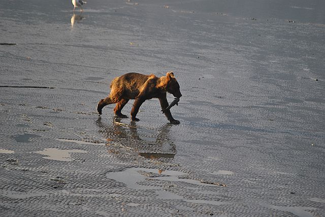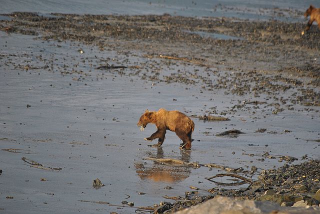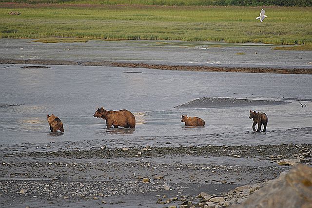 갯벌을 누비며 연어를 줍는 곰돌이들의 모습이