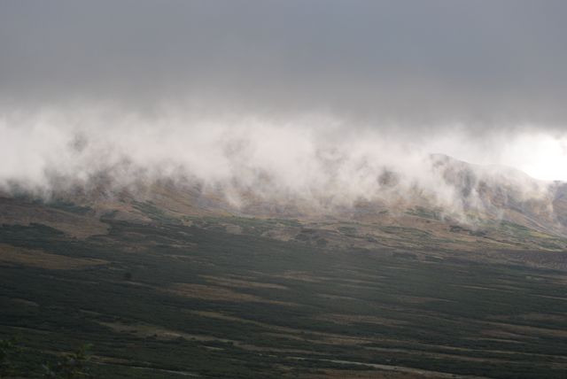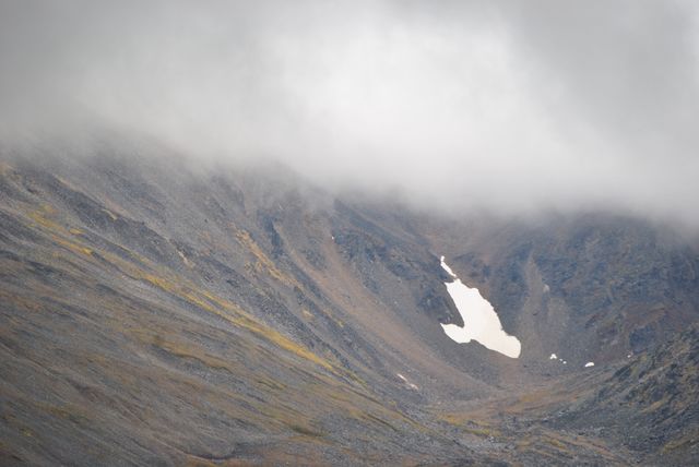 내려앉은 구름, 채 녹지 않은 만년설, 그리고 바위로 이루어진 높은 산이