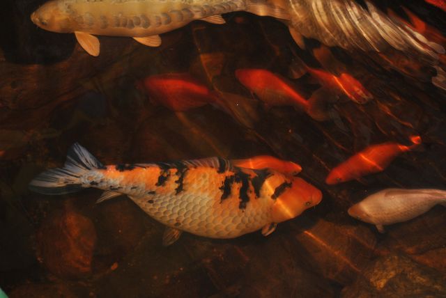 엄청 비대한 비단잉어들이 한가로이 헤엄을 치는 모습입니다.