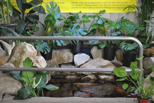 엄청 비대한 비단잉어들이 한가로이 헤엄을 치는 모습입니다.