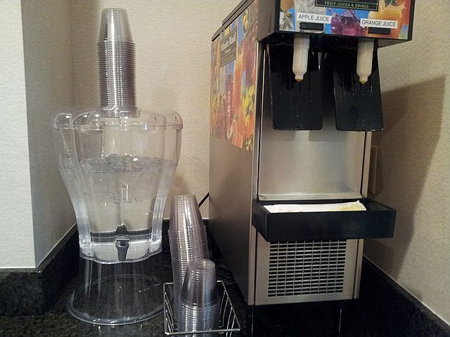 시원한 얼음냉수와 우측에는 사과주스와 오렌지 쥬스 입니다.