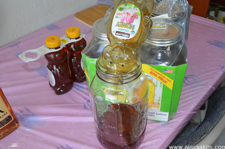 자! 일단 꿀 한 병을 모두 병에다가 붓습니다.
