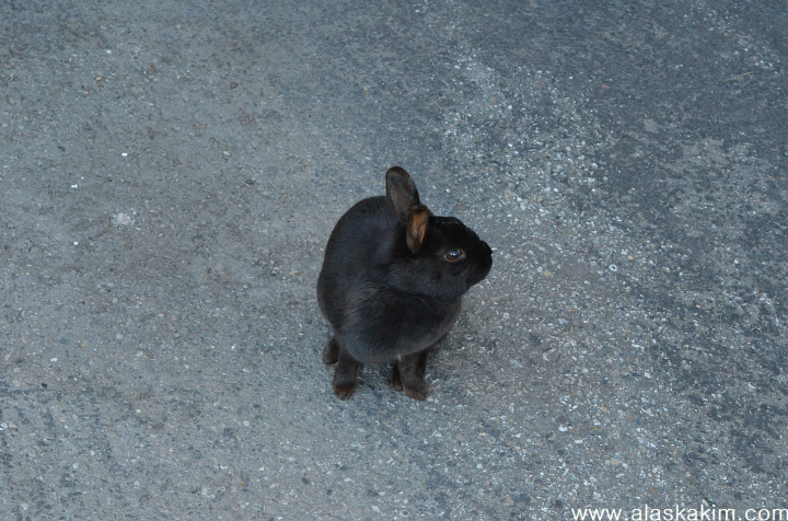 야생에서 자유롭게 돌아다니는 까만 토끼