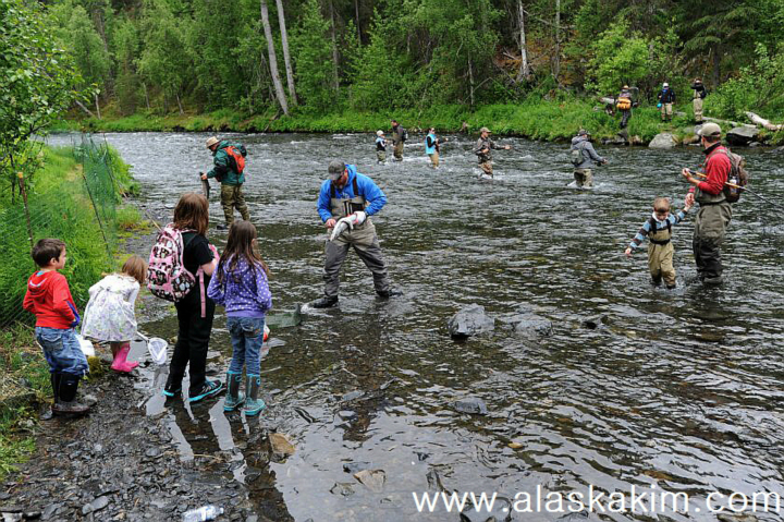 온 가족이 모두 몰려와 즐거운 연어잡이에 여념이